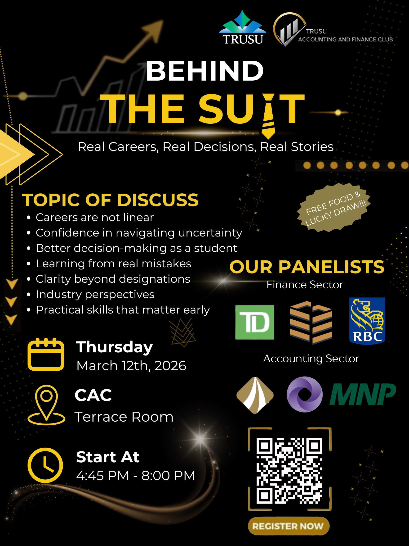 The event focuses on providing students with honest insight into professional career journeys within accounting, finance, and related industries. Rather than discussing only designations or technical pathways, the session highlights real experiences including early struggles, mistakes, pivotal decisions, industry realities, and practical advice students can apply now. The goal is to help students gain clarity, confidence, and a more realistic understanding of how careers evolve beyond the classroom.