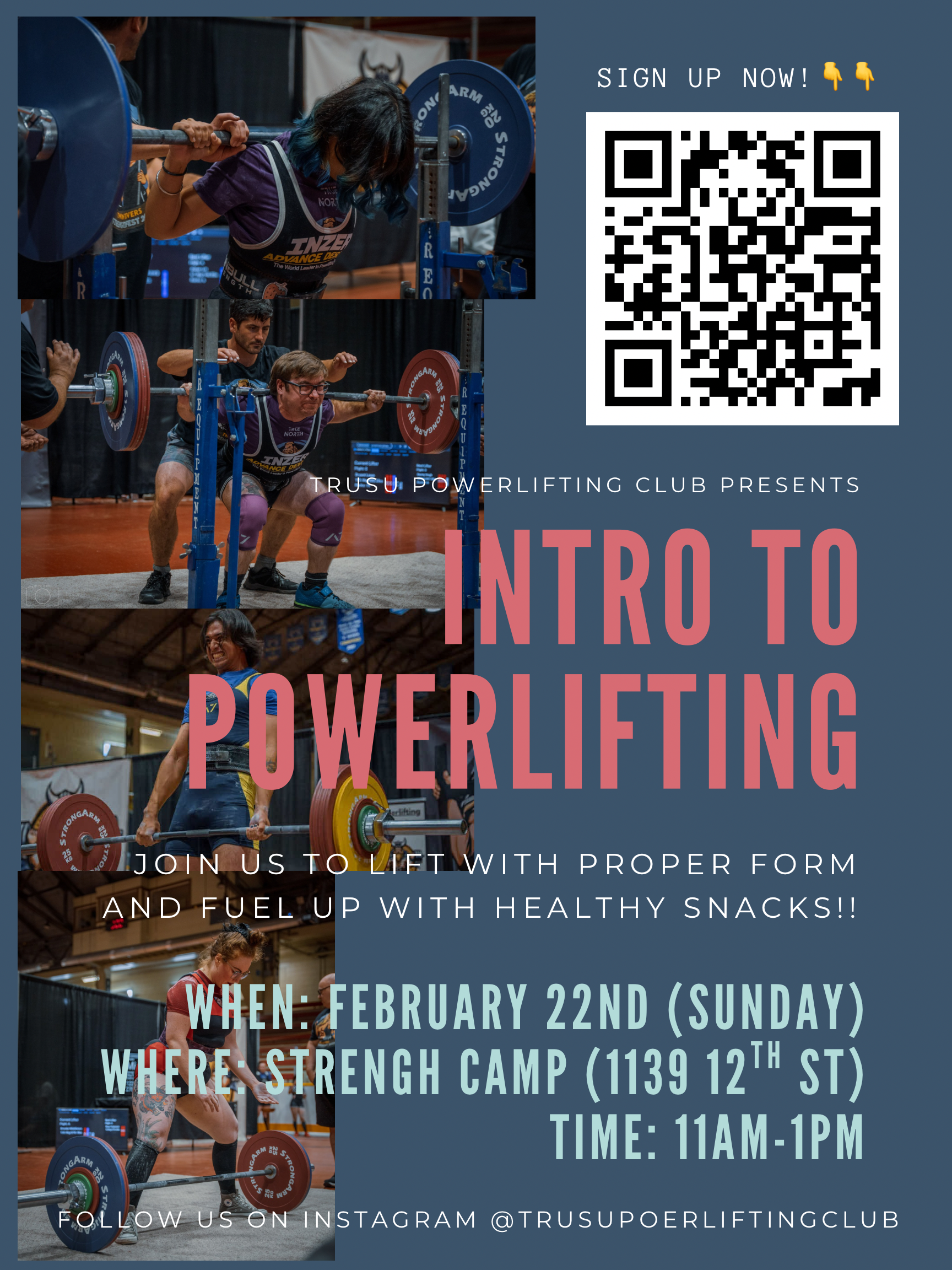 After the presentation, we’ll go through the three main powerlifting lifts: squat, bench press, and deadlift. A qualified coach will be present to lead the session, assist with lifting, and make sure everyone is using safe and proper technique. Each lift will be broken down step-by-step, including setup, form cues, and common mistakes.