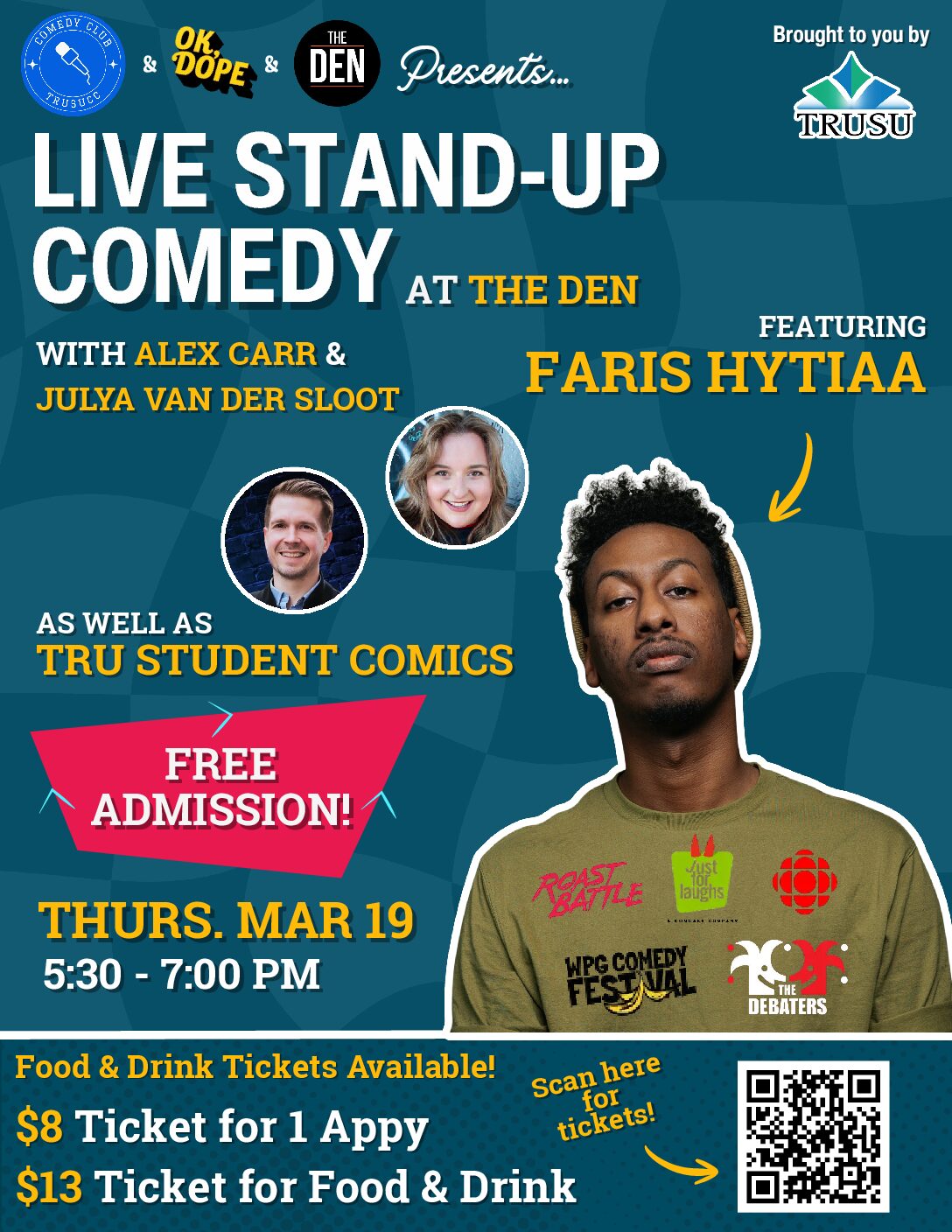 Presenting another fantastic Comedy Show at The Den Starting at 5:30pm on Thursday, the 19th of March, 2026 Come see the TRUSU Comedy Club and special guests, Faris Hytiaa, Julya Van der Sloot, and Alex Carr Food and Drink Tickets Available, $8 for an appy or $13 for a food and drink item restrictions apply […]