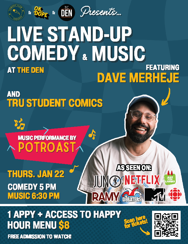 The Den 1055 University Dr, Kamloops, BC, CanadaCome see Stand Up Comedy and Music January 22nd @ 5pm. The TRUSU Comedy Club and TRUSU Music club present a live show @ The Den. Comedy performed by Alistair Ogden and the TRUSU Comedy Club, hosted by returning comic Jordan Strauss. Music to be performed by the TRUSU Music Club. Comedy will take place […]
