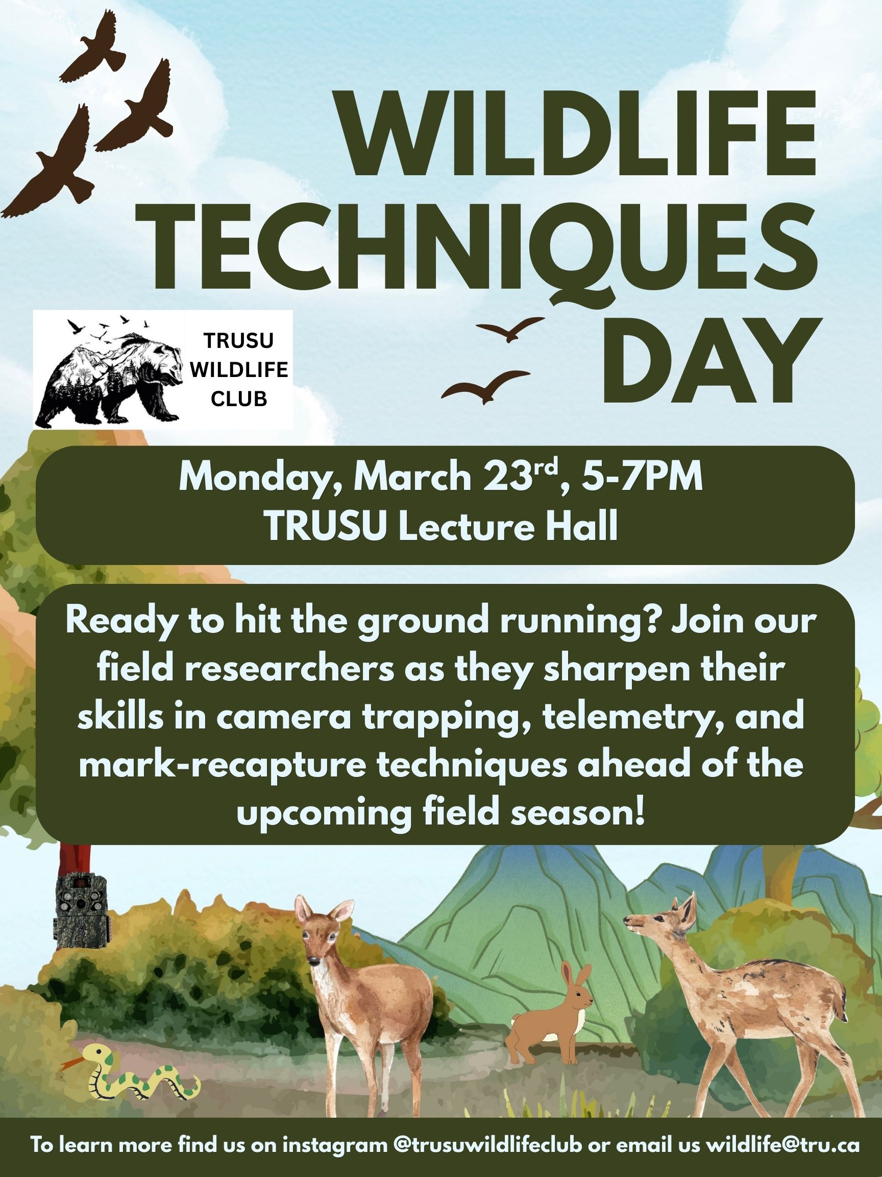 TRUSU Lecture Hall 1055 University Drive, Kamloops, BC, CanadaLearn about different ways to monitor wildlife and gain hands-on experience with the equipment used! Techniques covered include: Trail Cameras Mark/Recapture Methods PIT Tags Radio Telemetry Small Mammal Trapping This is a great opportunity to learn about equipment used in Wildlife research and talk with Environmental Master's students and Wildlife Professors who have experience using […]