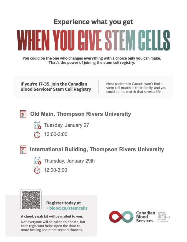 Old Main - Student Street 835 University Drive, Kamloops, BC, CanadaThe TRUSU Blood Club is joining Canadian Blood Services and post-secondary clubs across Canada in recruiting students to join the STEM cell registry. As a TRU student, you will have the opportunity to complete a swab kit that could save a life. Don’t miss this chance to make a real difference!